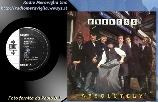 Gruppo: *Madness* - disco: *Absolutely*. Anno 1980... Secondo album del gruppo ska britannico Madness. In copertina la band davanti alla stazione metropolitana di Chalk Farm a Camden. La foto di copertina dopo la stampa di circa 10.000 album, venne cambiata con una posa più animata. Le due versioni molto simili possono essere distinte dalla presa dell'ombrello di Mike Barson: nella prima lo tiene alzato fino al mento mentre nella seconda lo spinge a terra.