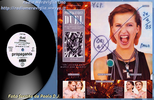 Gruppo: *Propaganda* - disco: *Duel*. Singolo di grande successo nell’Europa del 1985. Strano destino quello dei Propaganda: nati in Germania, pensati per il pubblico inglese che prima di sciogliersi ebbe successo soprattutto in Italia. Tra tutte le classifiche europee il risultato italiano migliore fu appunto “Duel” che arrivò al 2° posto in classifica e ancora oggi noi non ci siamo dimenticati di loro!